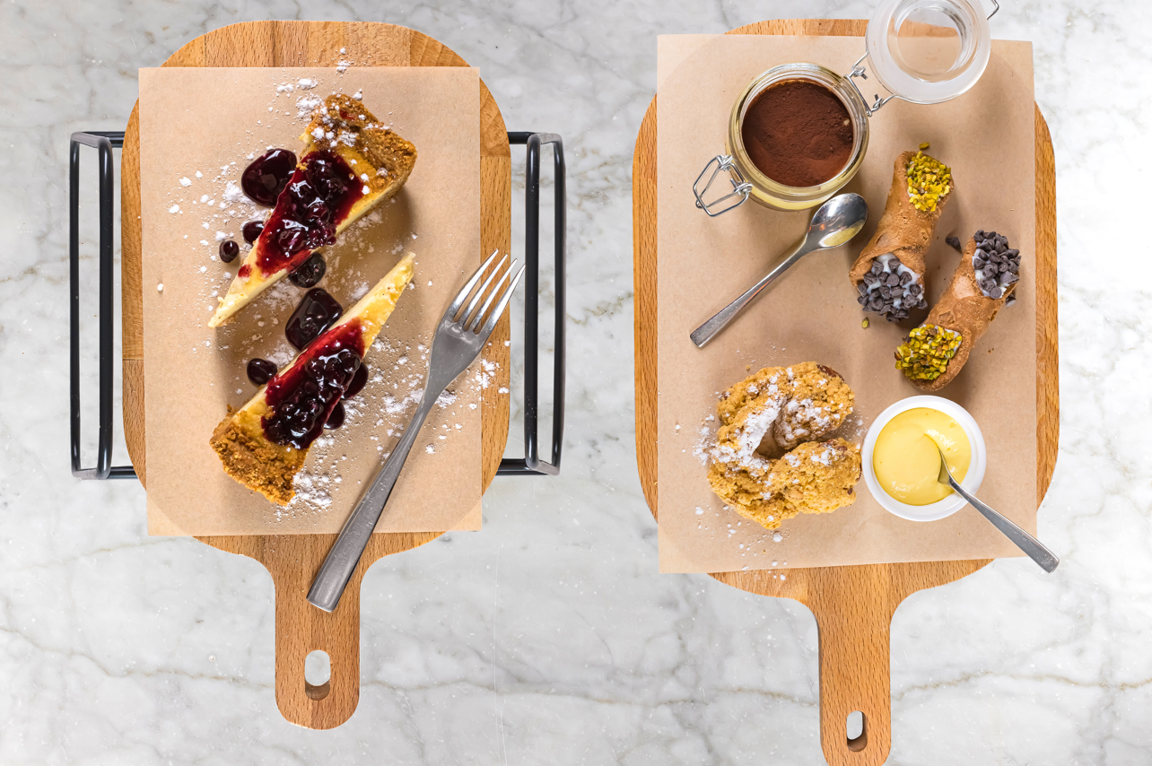 Mini cannoli siciliani, sbrisolona con crema Chantilly,tiramisù e cheesecake con salsa ai frutti di bosco