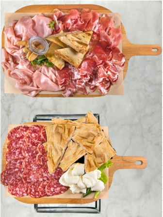 • Prosciutto di Parma DOP 24 mesi “Piazza Peppino” • Mortadella Favola Gran Riserva “Palmieri” • Salame campagnolo “Peveri” • Coppa Piacentina DOP “Grossetti” • Petali di Bufala • Focaccia “Pinsa” • Mini grissini al mais