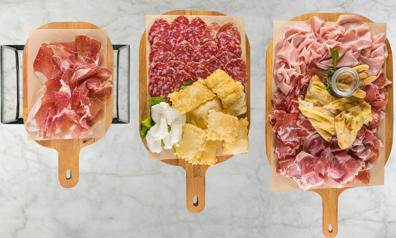 • Prosciutto di Parma DOP 24 mesi “Piazza Peppino” • Mortadella Favola Gran Riserva “Palmieri” • Salame campagnolo “Peveri” • Coppa Piacentina DOP “Grossetti” • Culatello di Zibello DOP • Spalla cotta La Proibita “Capitelli” • Petali di Bufala • Focaccia “Pinsa” • Gnocco fritto • Mini grissini al mais
