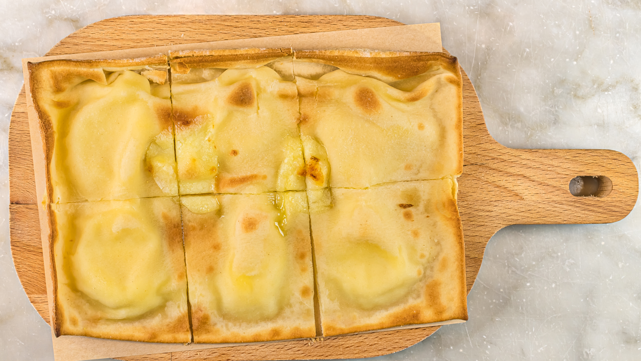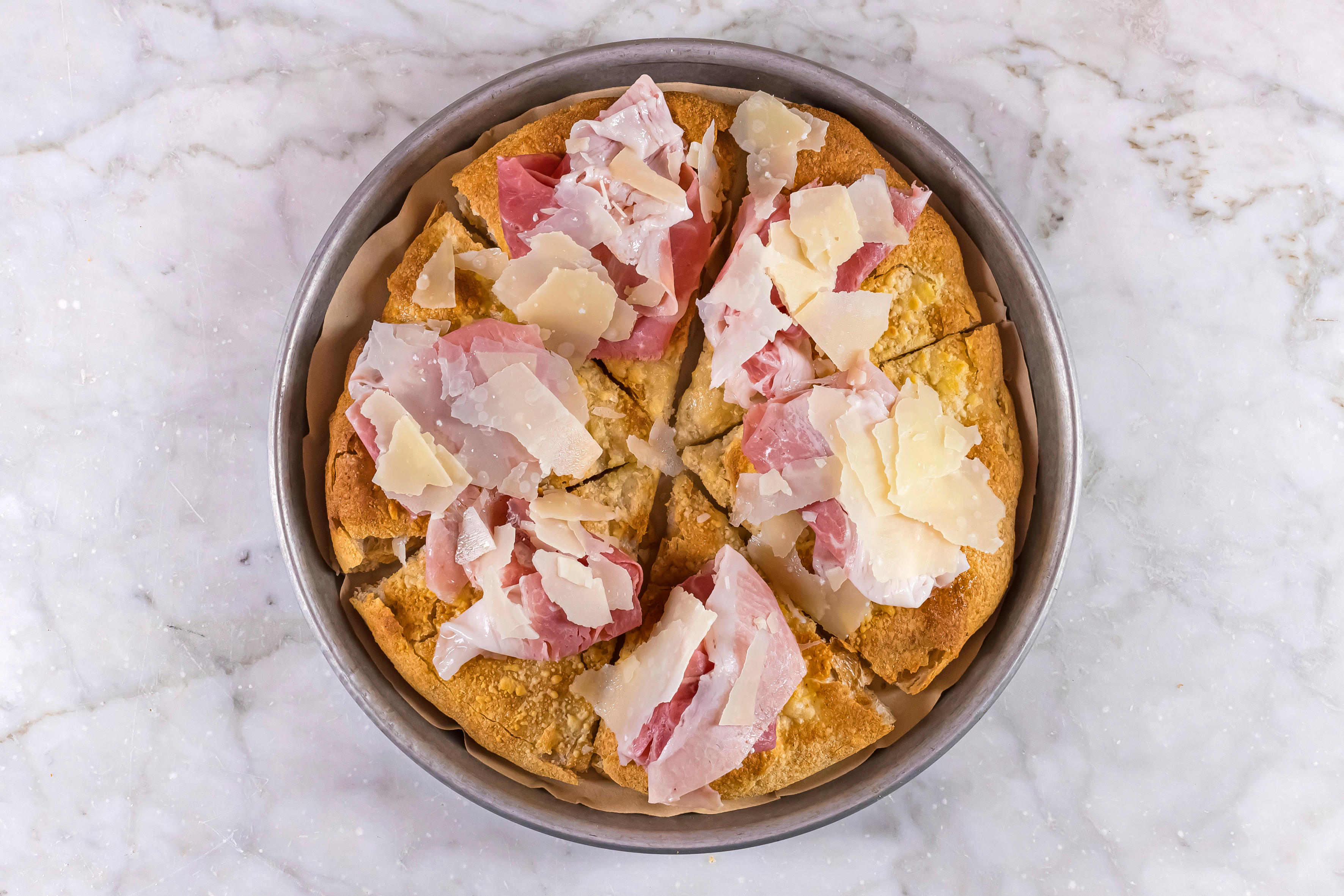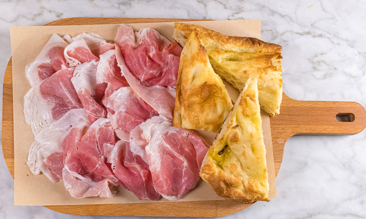 Focaccia bianca con Spalla cotta La Proibita “Capitelli”e scaglie di Parmigiano Reggiano DOP 24 mesi