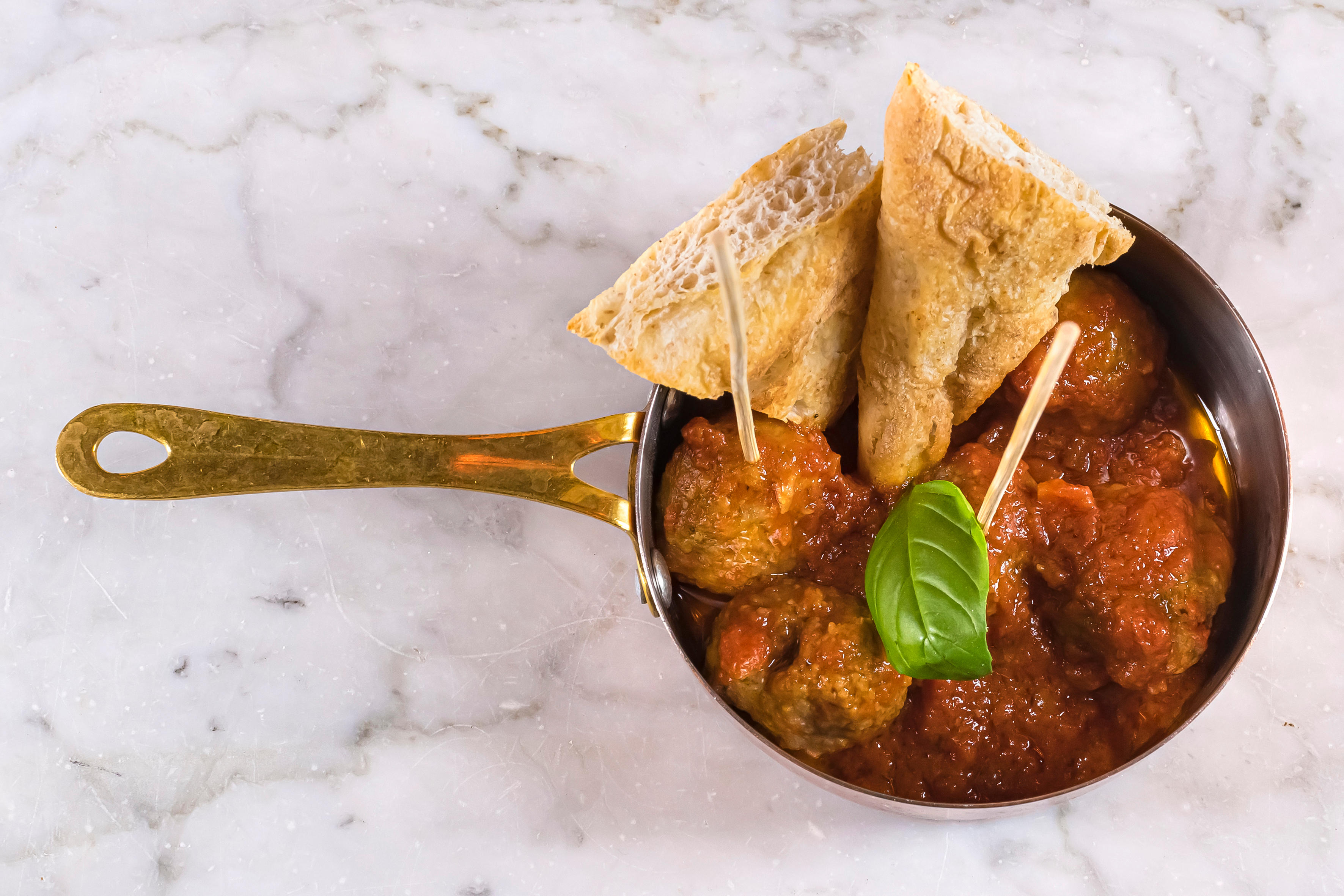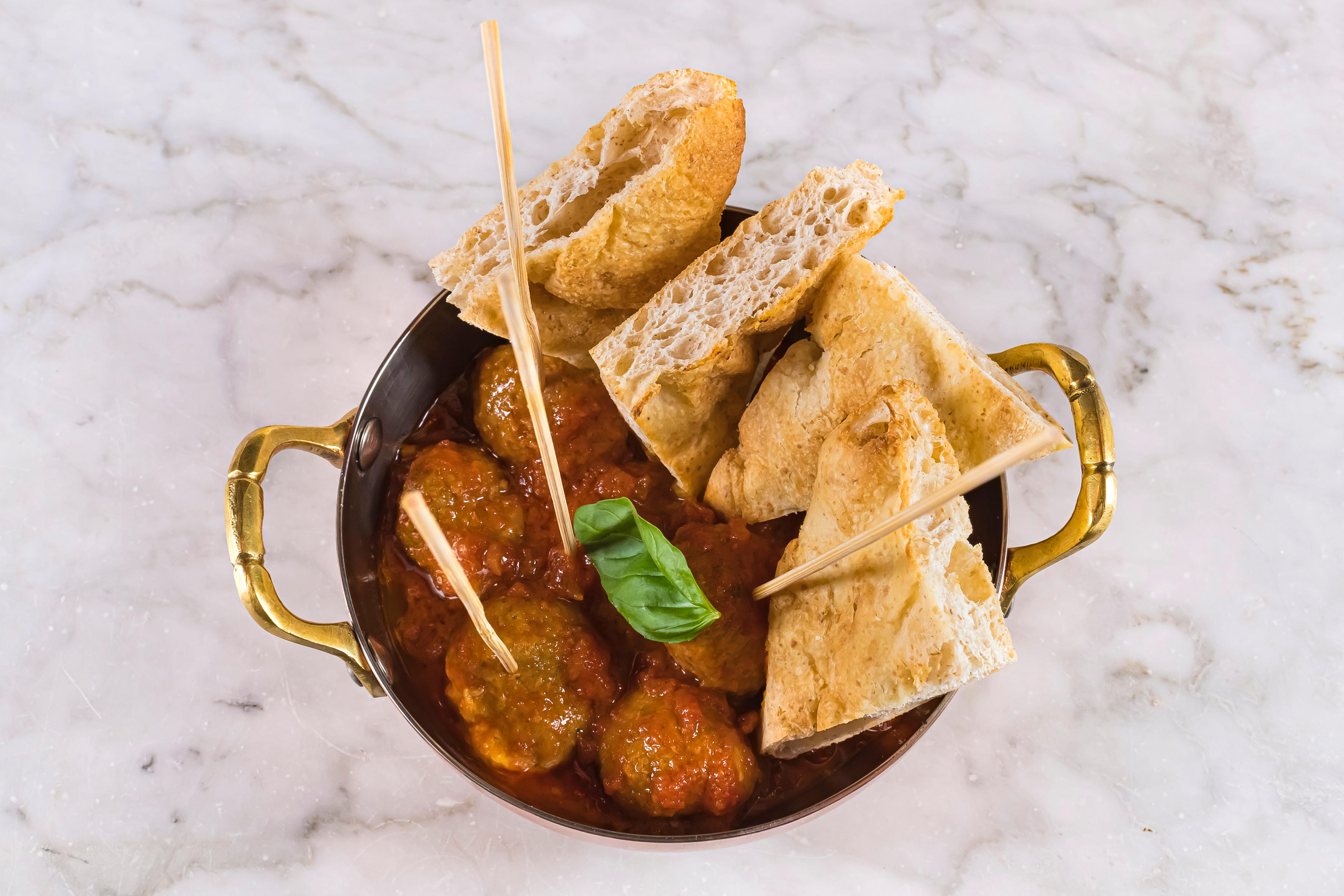 (5pz) Polpette di manzo al sugo di pomodoro con focaccia “Pinsa”