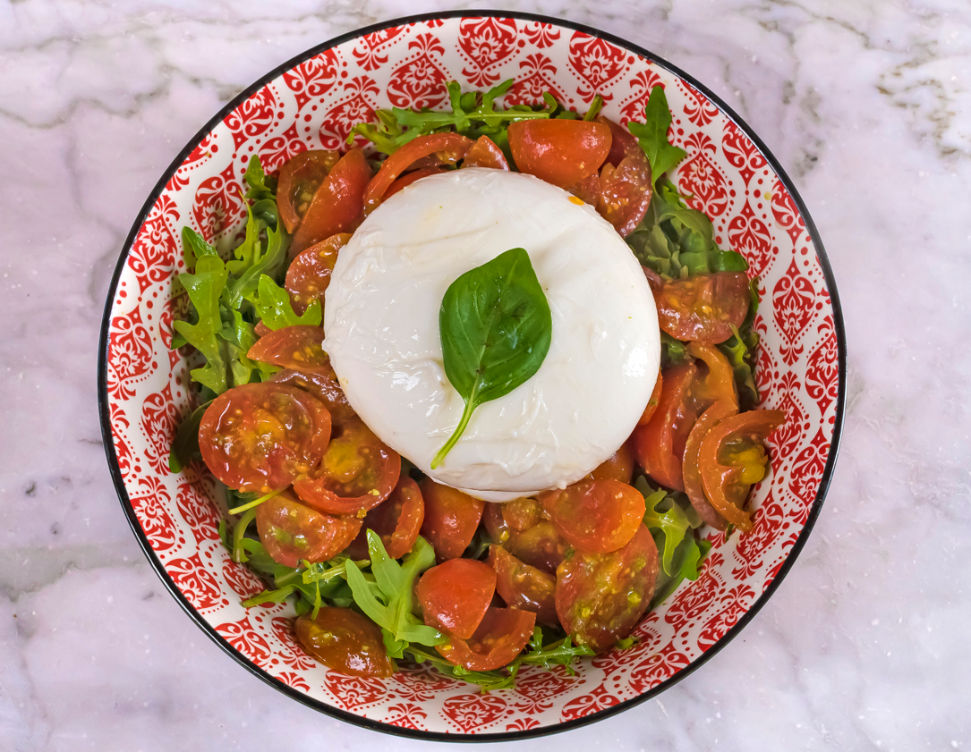 Burrata pugliese con pomodorini freschi e pesto di basilico Genovese DOP
