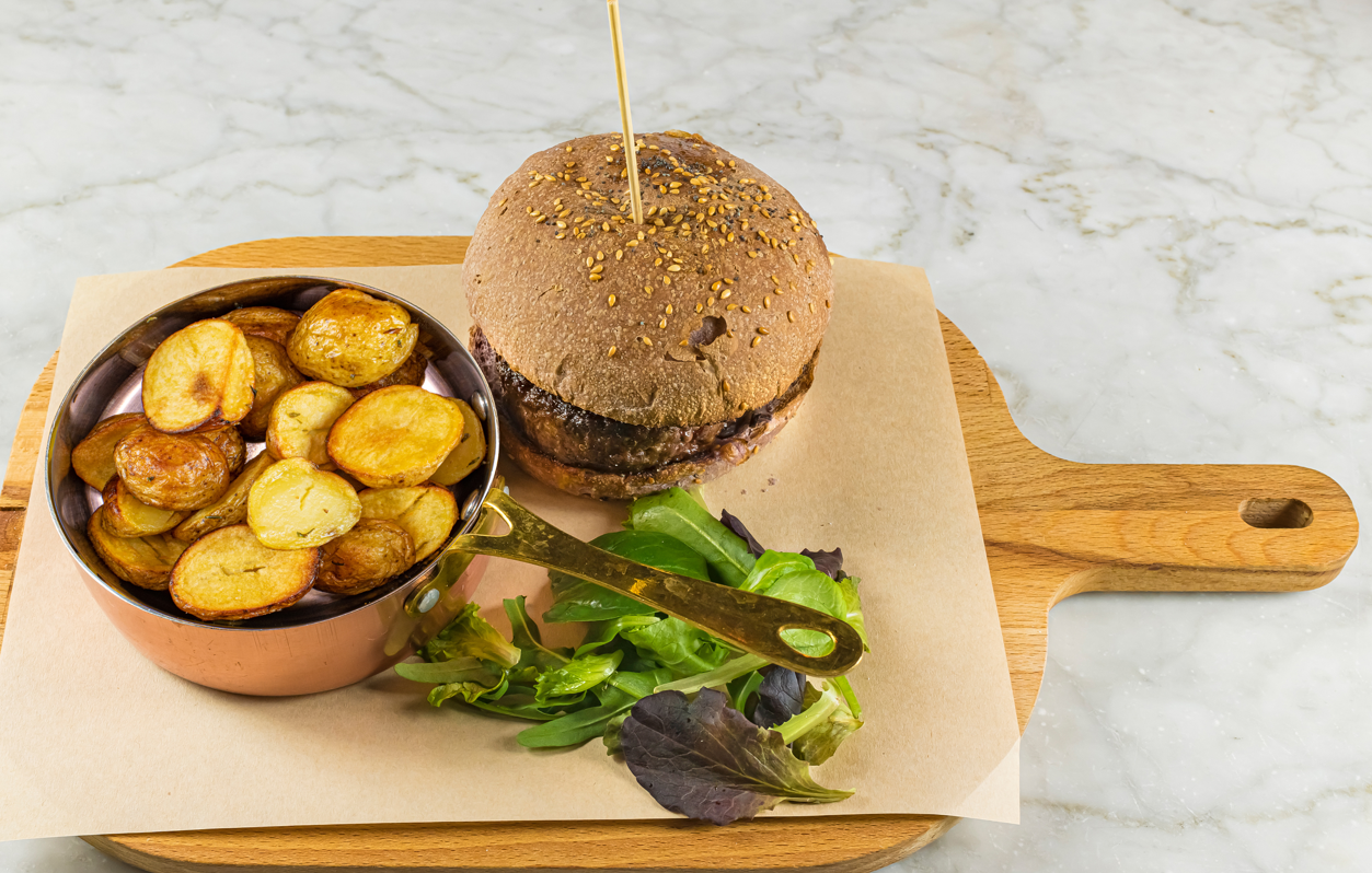 Pane al Lambrusco, burger 100% manzo, Fontina DOP, senape al miele e cipolla rossa agrodolce, servito con patate al forno