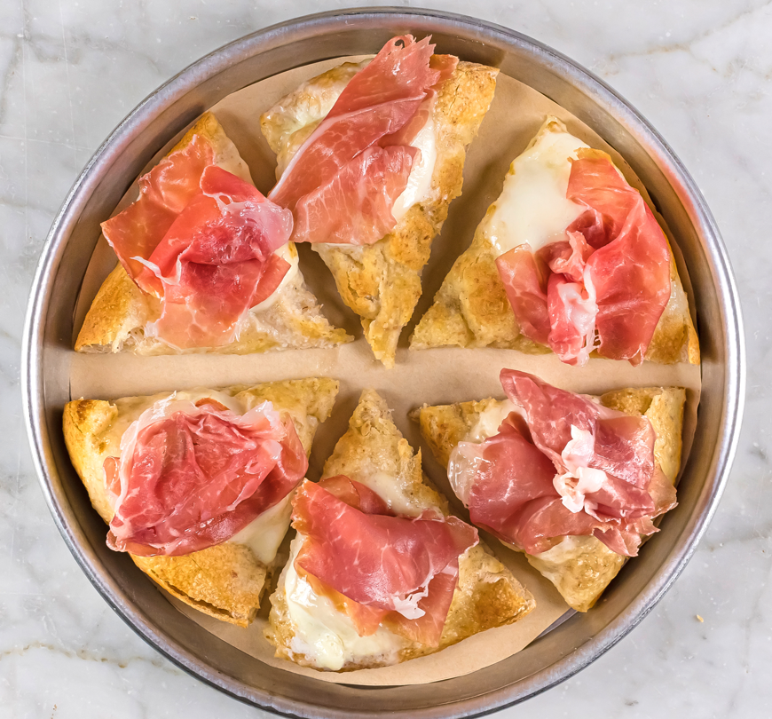 Focaccia bianca con Prosciutto di Parma DOP 24 mesi e petali di Bufala filante