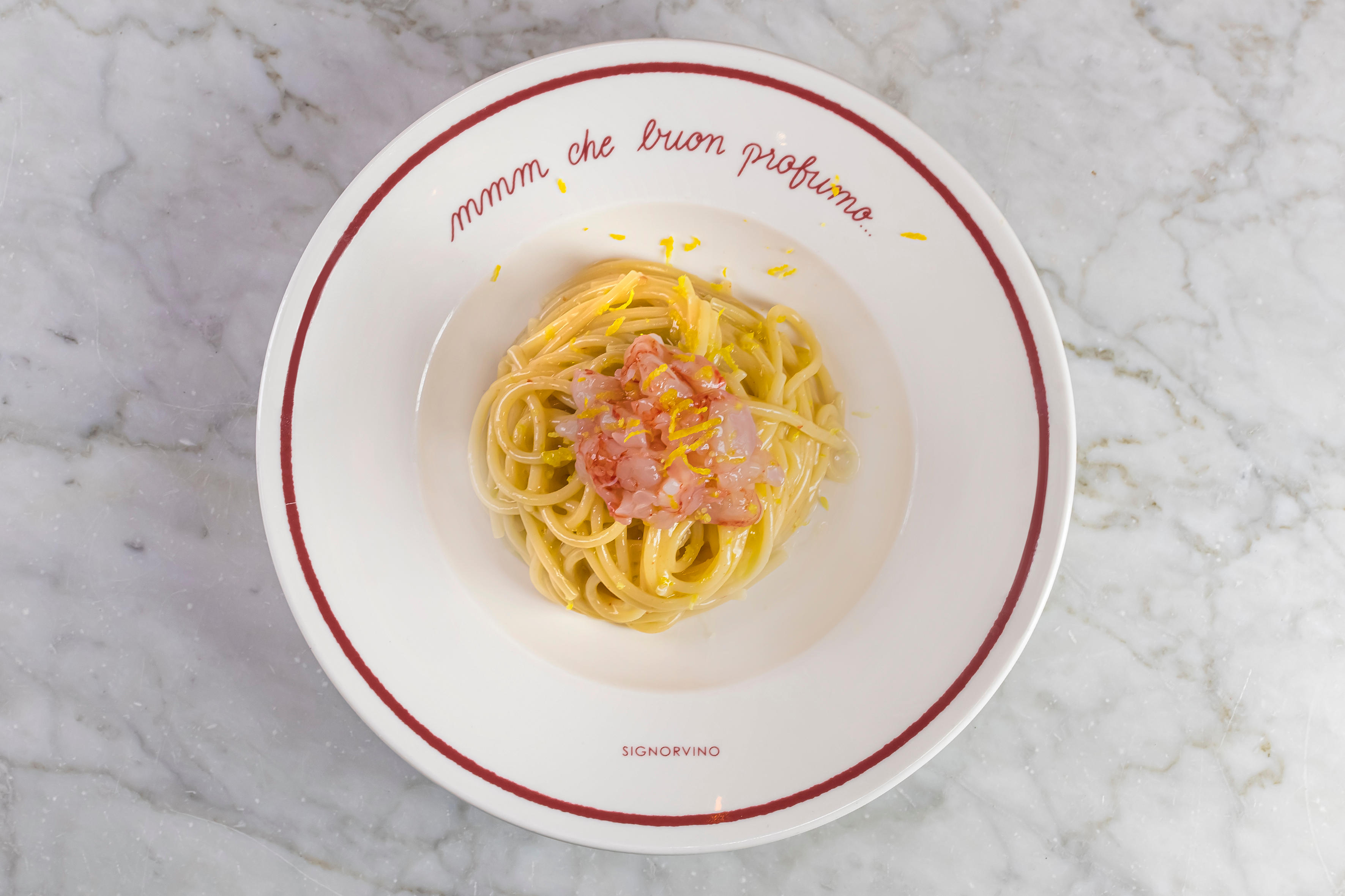 Spaghetti “Il Cappelli” Monograno Felicetti all’aglio, olio e peperoncino con tartare di gambero rosso e scorzetta di limone