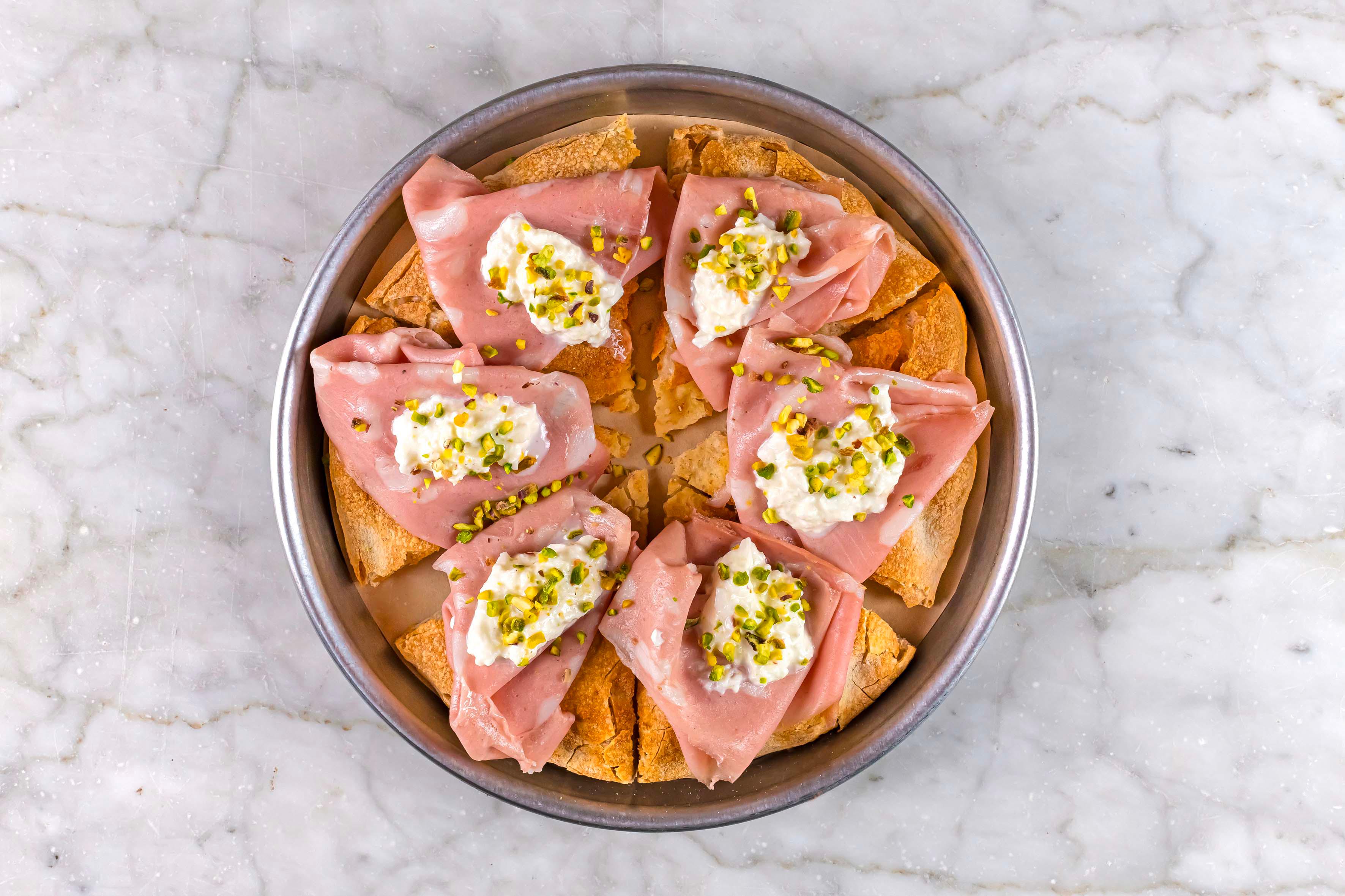 Focaccia bianca con Mortadella Favola Gran Riserva, burrata pugliese e granella di pistacchio