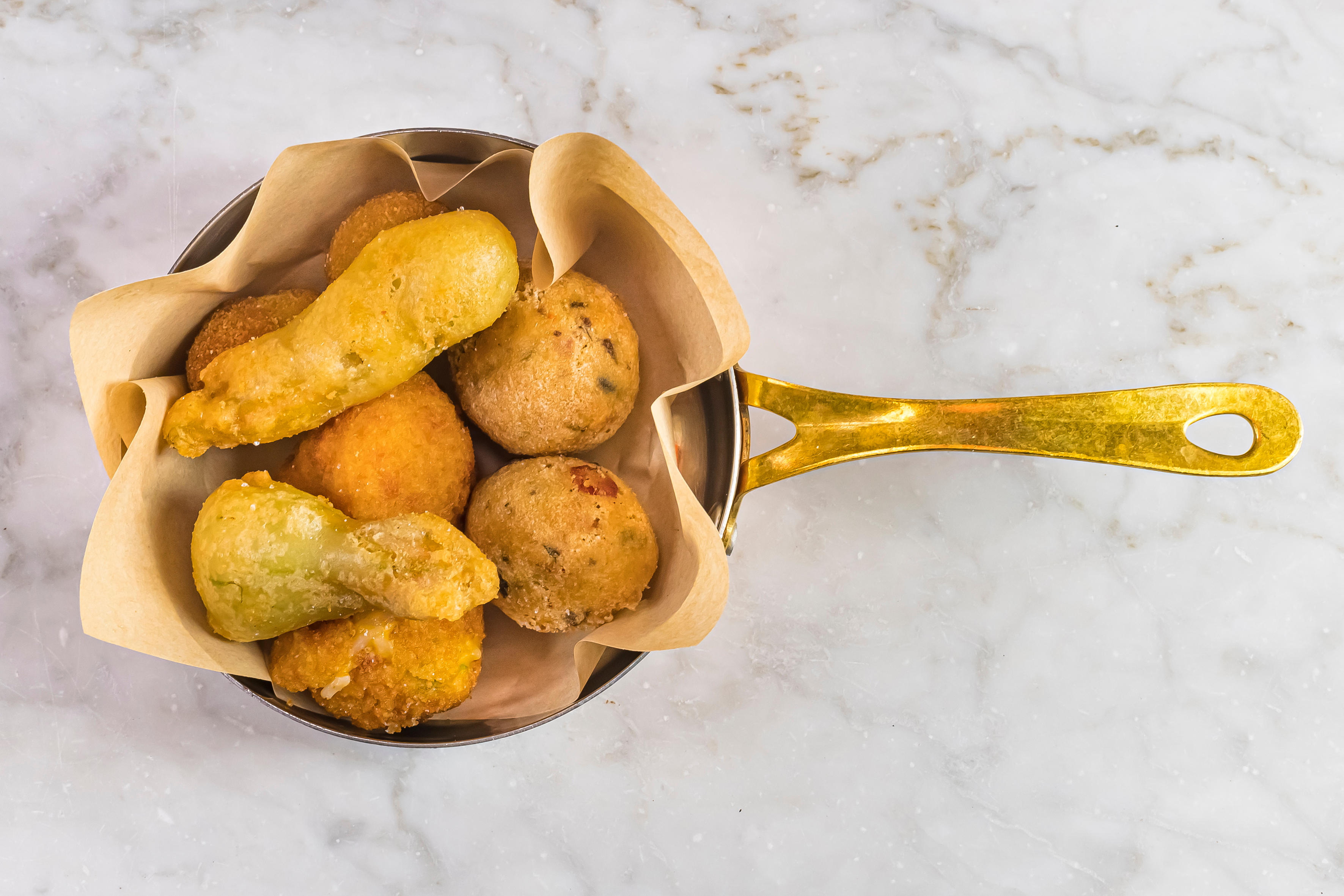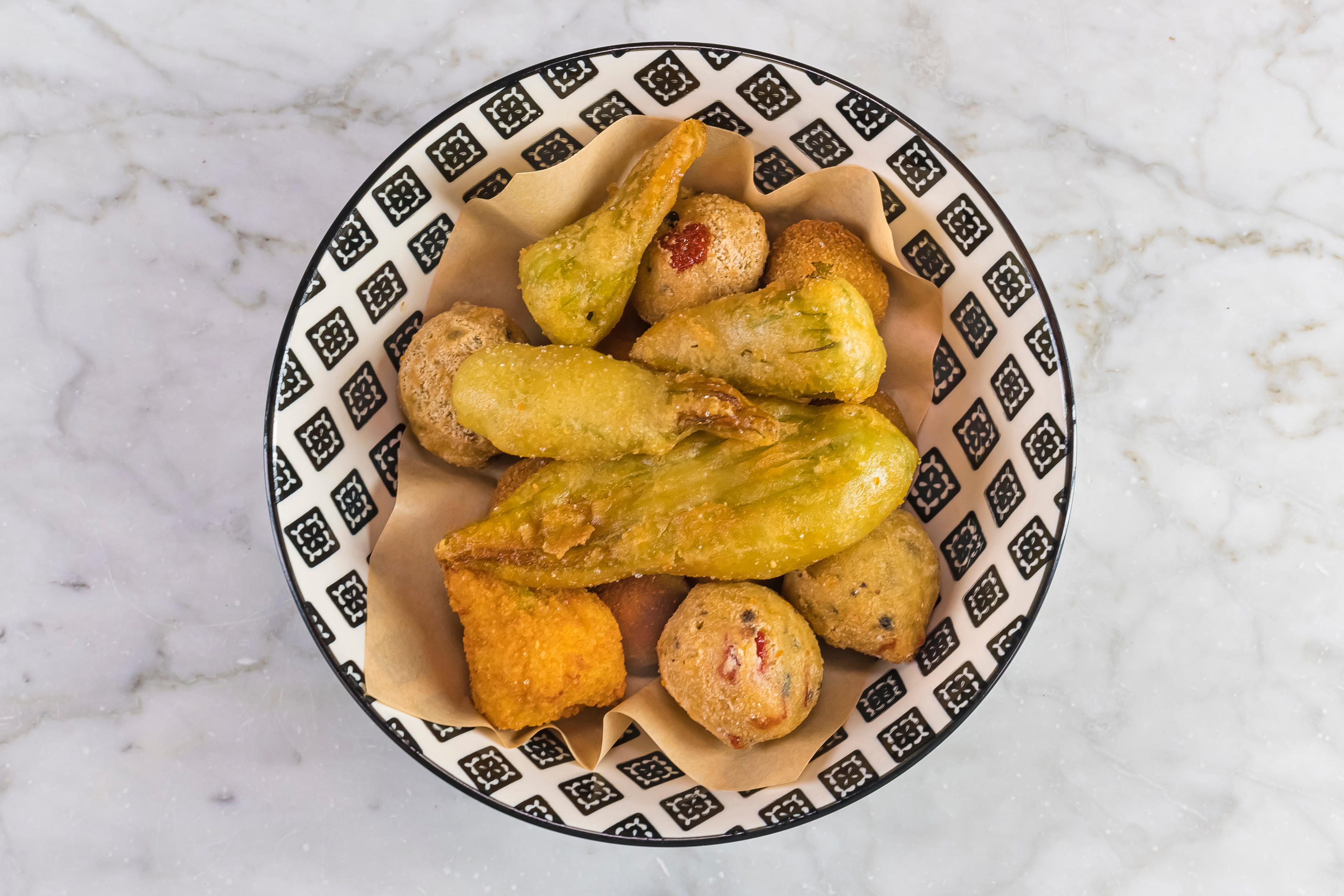 (8pz) Fiori di zucca in crosta di grano duro, le vere olive all’ascolana, arancini siciliani al ragù e frittelle di pane olive e peperoni
