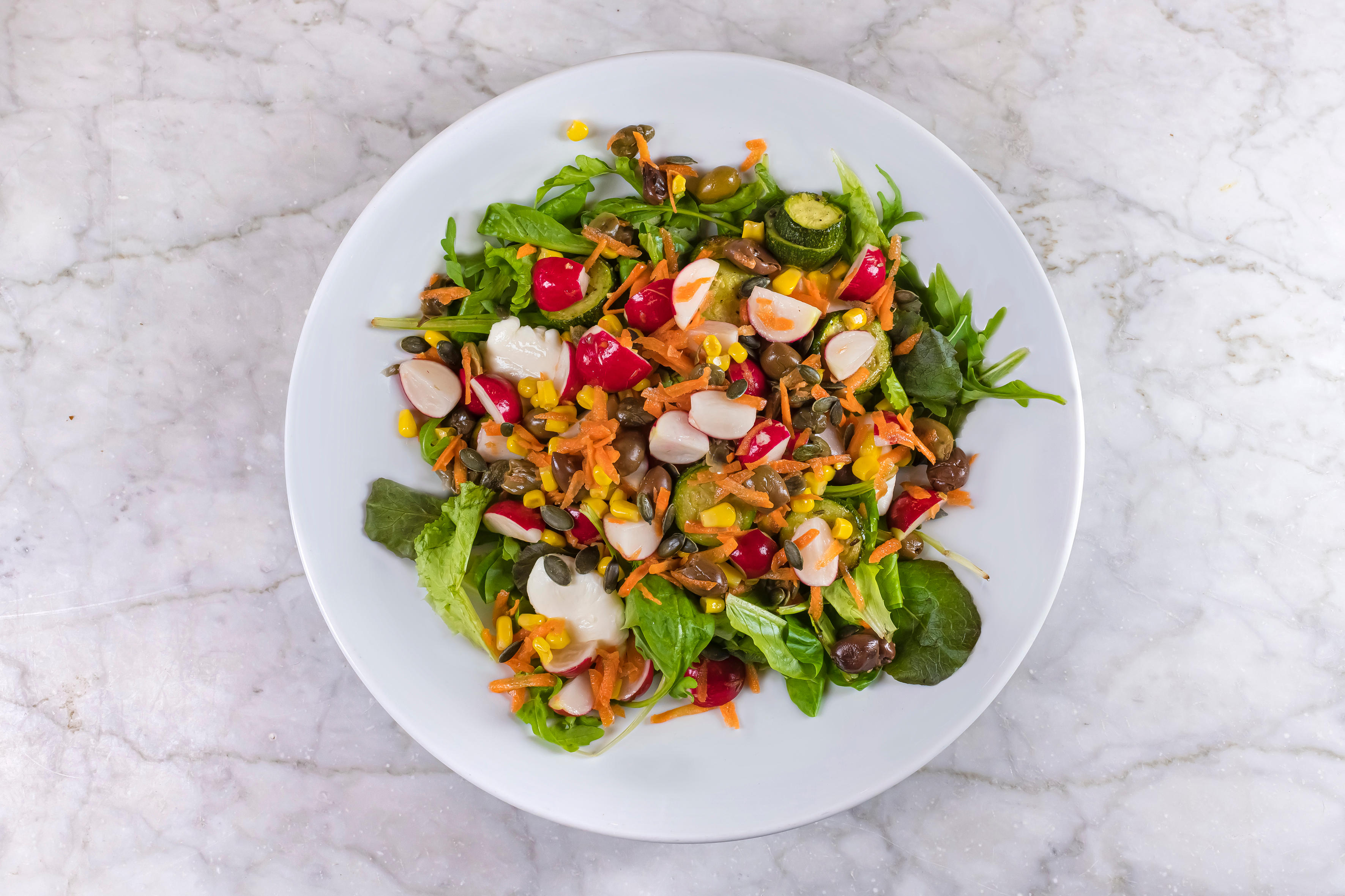 Misticanza, petali di Bufala, carote, zucchine al forno, ravanelli, olive taggiasche, mais, capperi e semi di zucca croccanti(Naturalmente priva di glutine)