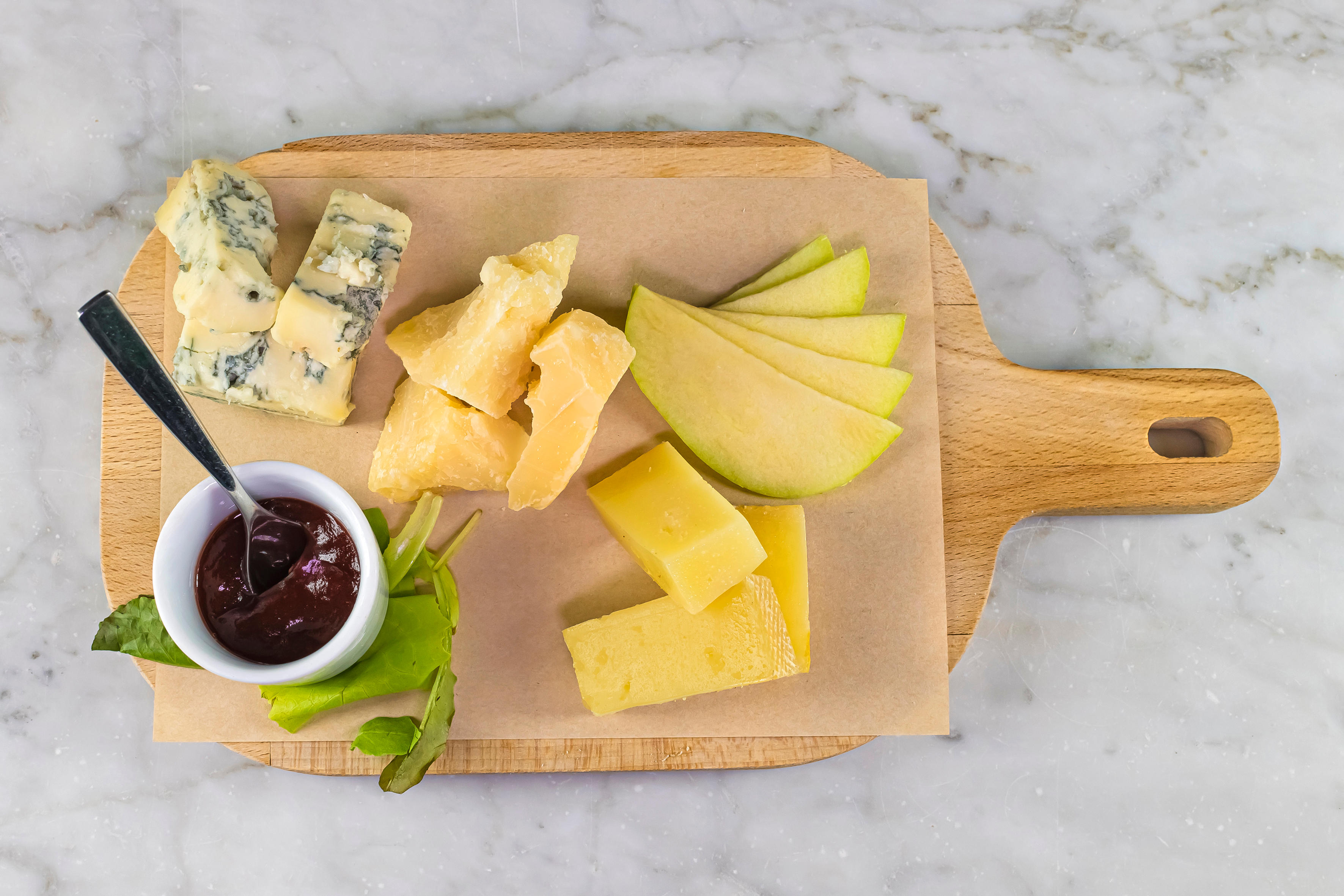 Parmigiano Reggiano DOP 24 mesi “Ambrosi”, Formaggiotipico di Branzi, Gorgonzola dolce DOP “Gran Riserva Leonardi”e confettura di prugne e Chianti DOCG