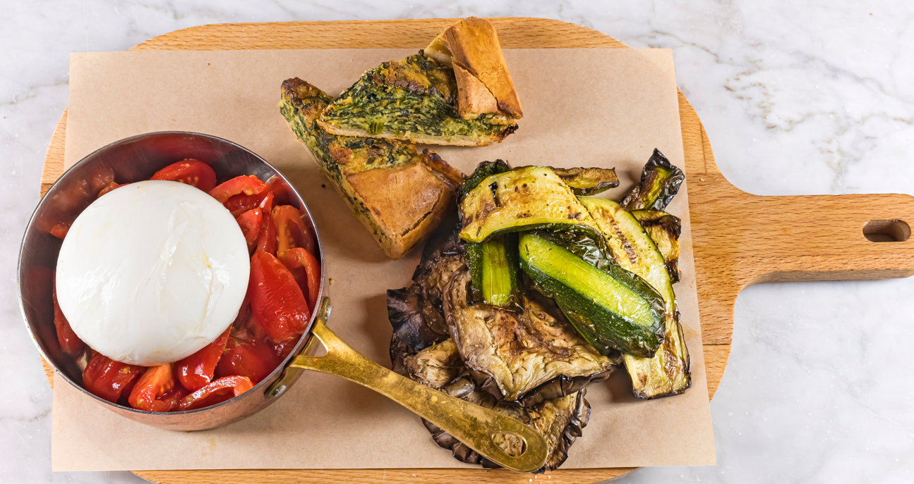 Torta salata ripiena di zucchine, spinaci e ricotta servita con burrata pugliese, pomodorini freschi, pesto di basilico Genovese DOP e verdure grigliate