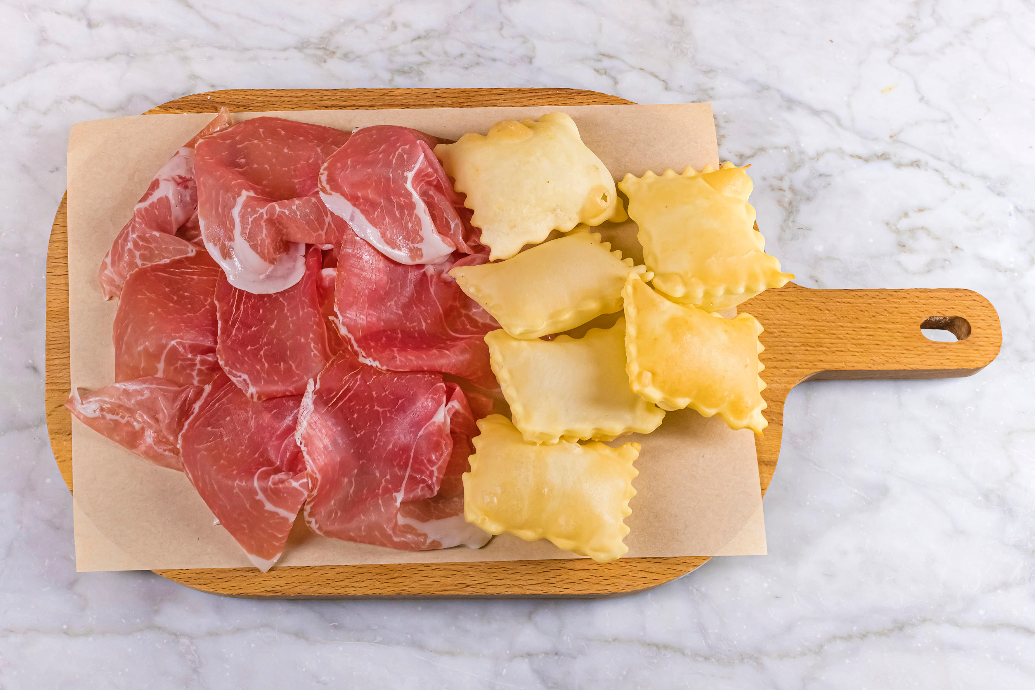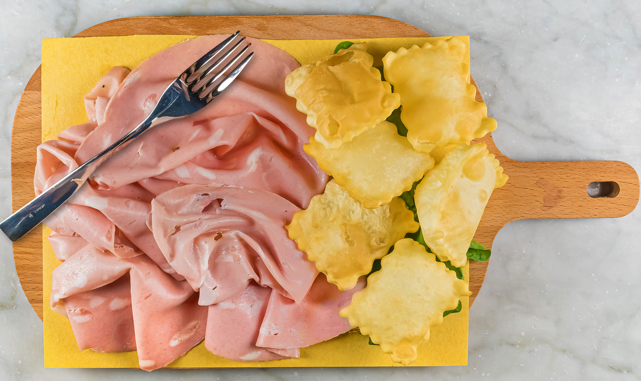 Mortadella Favola Gran Riserva “Palmieri” (miglior mortadella d’Italia secondo la Guida “Salumi d’Italia”) servita con gnocco fritto