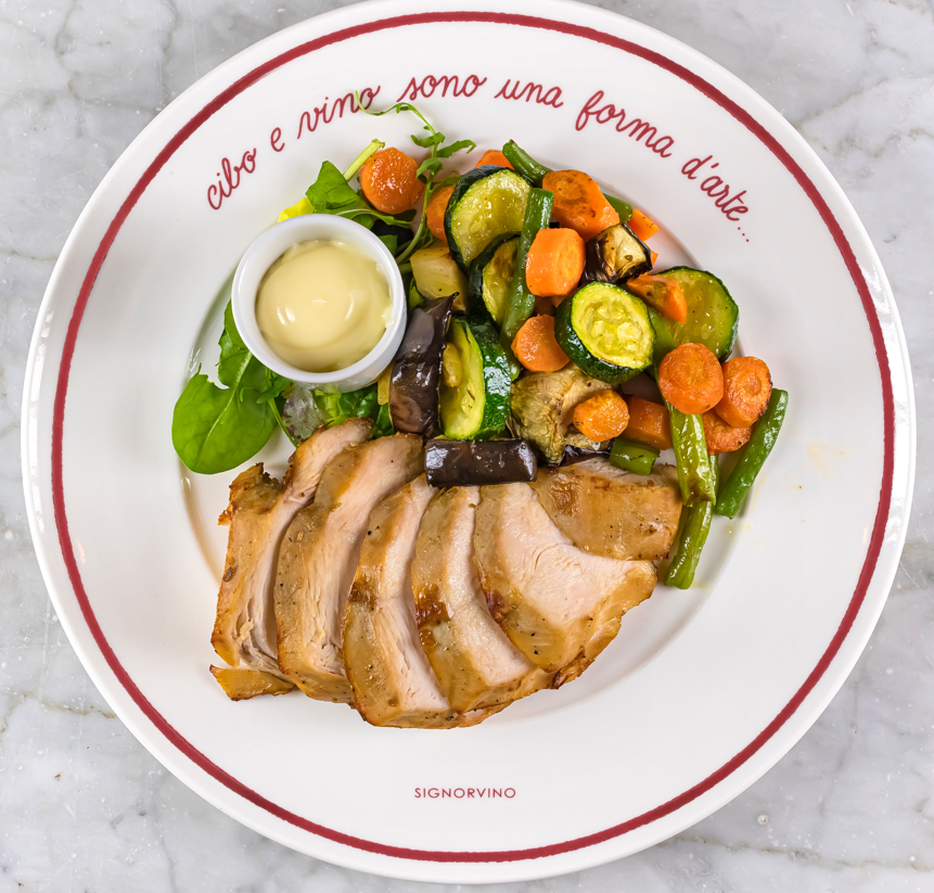 Tagliata di petto di pollo con verdure di stagione al forno e mayo al Gewürztraminer
