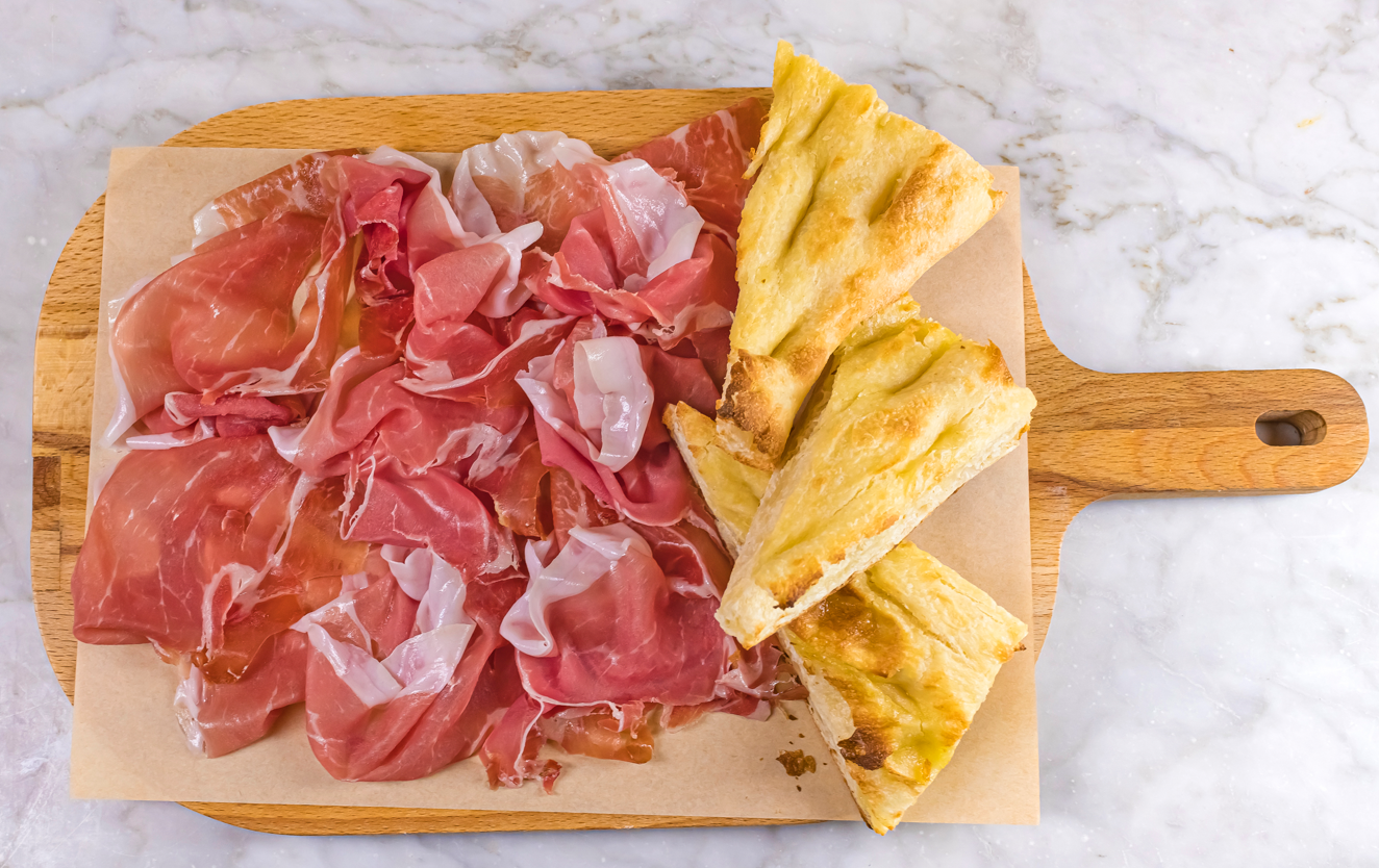 Prosciutto di Parma DOP 24 mesi “Piazza Peppino”con focaccia “Pinsa”