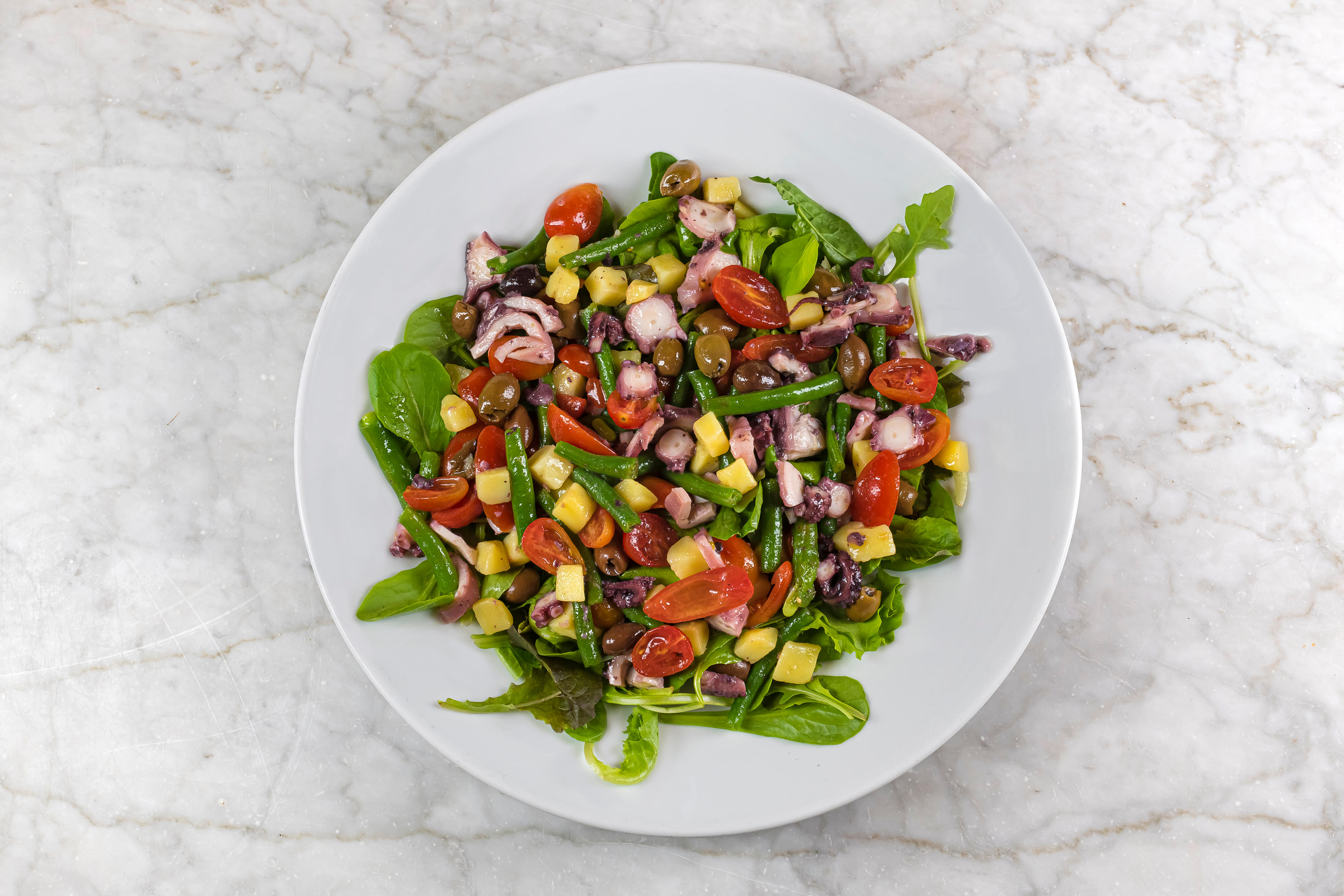 Polpo, misticanza, patate, fagiolini, pomodorini freschi e olive taggiasche(Non contiene lattosio - Naturalmente priva di glutine)