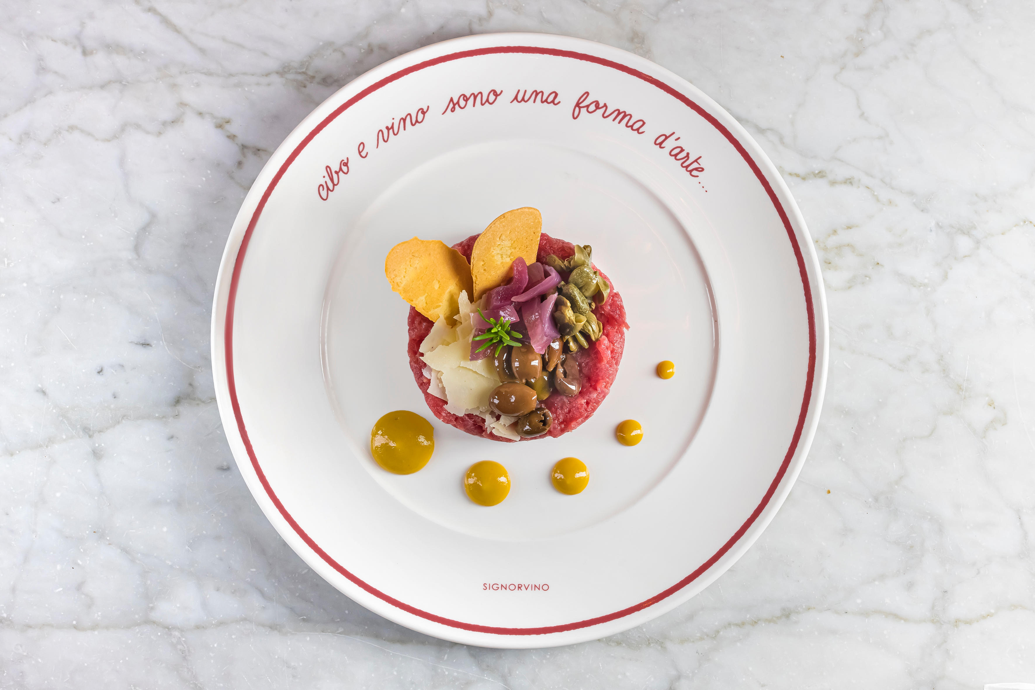 Tartare di manzo, cialde croccanti di Parmigiano Reggiano, cipolla rossa agrodolce, olive taggiasche, capperi, scaglie di Parmigiano Reggiano DOP 24 mesi e salsa di senape al miele