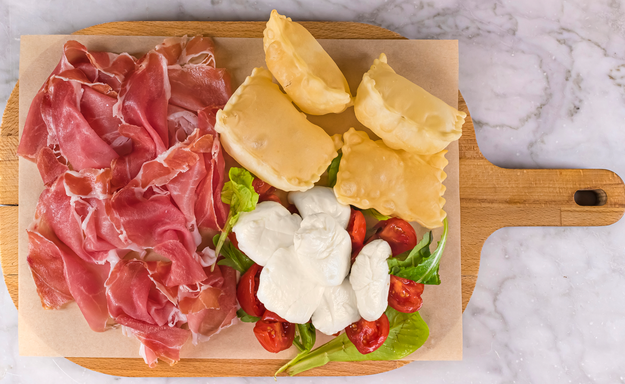 Prosciutto di Parma DOP 24 mesi “Piazza Peppino”,petali di Bufala, gnocco fritto e pomodorini freschi